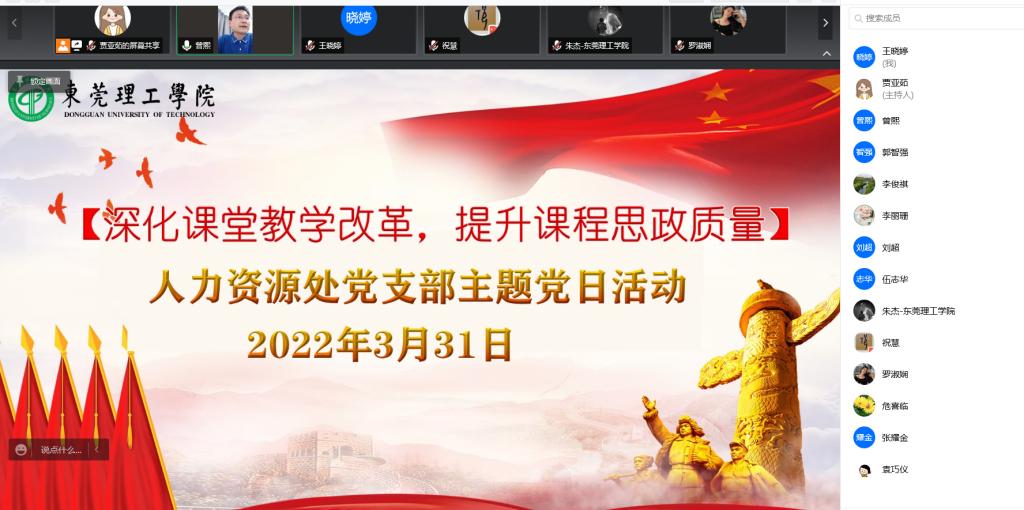 为深入推进学校争创一流本科2025行动计划实施和“三全育人”综合改革建设,加大课堂教学改革力度,完善全员全过程全方位育人格局,学校开展教育教学大讨论活动。根据学校和机关党委工作要求,3月31日,人资处党支部开展了“深化课堂教学改革 提升课程育人质量”主题党日活动。结合疫情防控实际,本次主题党日活动通过线上开展。支部全体党员参加活动。支部临时负责人曾熙同志主持主题党日活动。