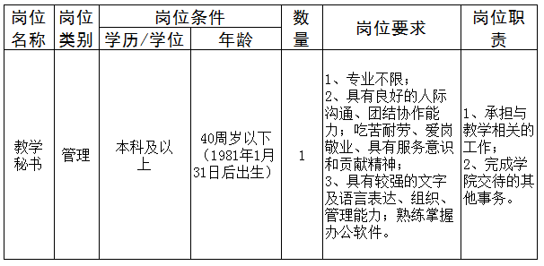 根据学校工作部署,现面向校内招聘教学秘书1名,有关事项公告如下: