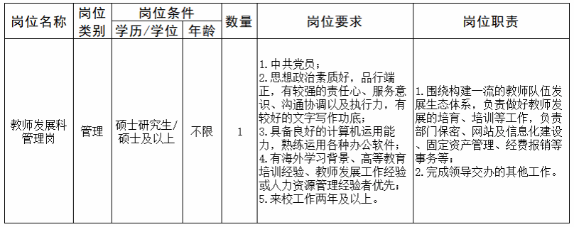 由于工作需要,现面向校内招聘党委教师工作部(教师发展中心)教师发展科管理岗位工作人员1名。有关事项公告如下: