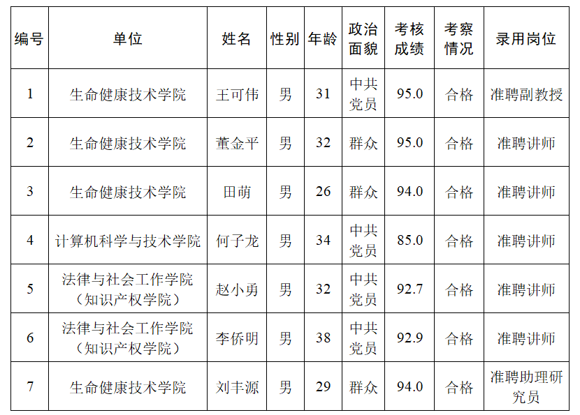 经过考核、考察等程序,拟聘用王可伟等7名同志到3044am永利集团官网工作,现予以公示,公示名单见下表。