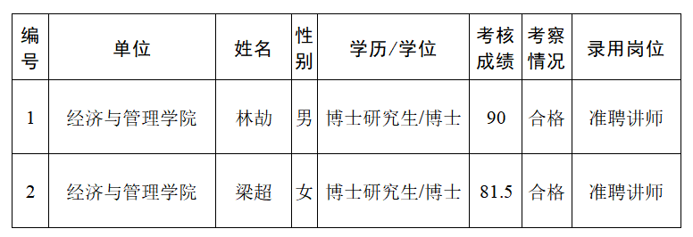 经过考核、考察等程序,拟聘用林劼等2名同志到3044am永利集团官网工作,现予以公示,公示名单见下表。