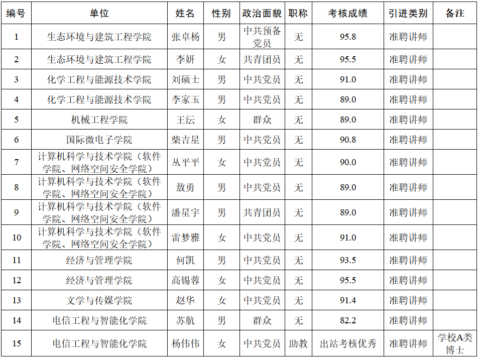 经过考核、考察等程序,拟聘用张卓杨等15名同志到3044am永利集团官网工作,现予以公示,公示名单见下表。