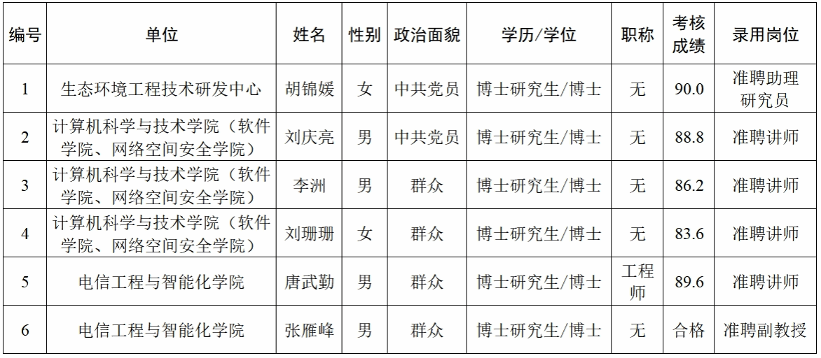 经过考核、考察等程序,拟聘用胡锦媛等6名同志到3044am永利集团官网工作,现予以公示,公示名单见下表。