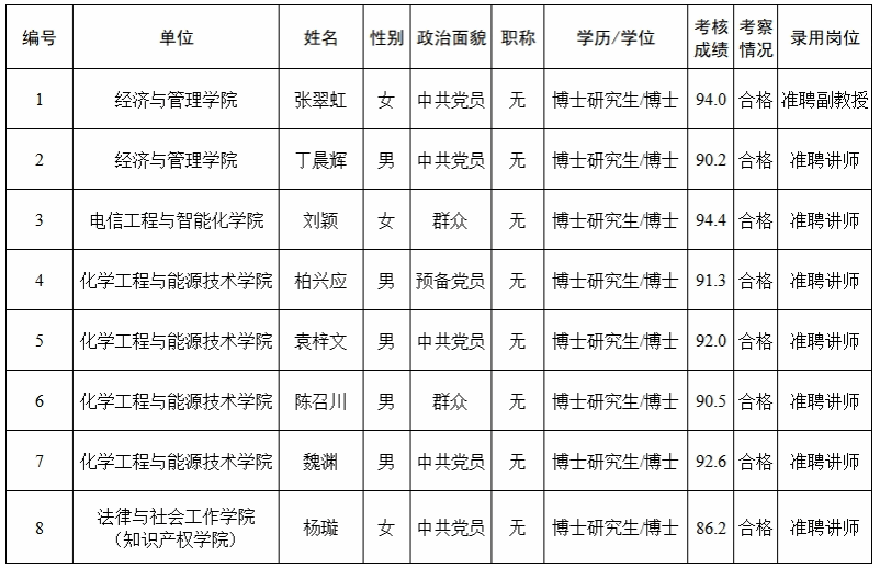 经过考核、考察等程序,拟聘用张翠虹等8名同志到3044am永利集团官网工作,现予以公示,公示名单见下表。