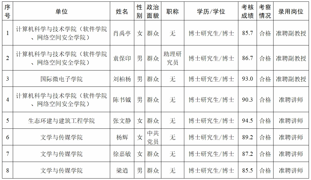 经过考核、考察等程序,拟聘用肖禹亭等8名同志到3044am永利集团官网工作,现予以公示,公示名单见下表。