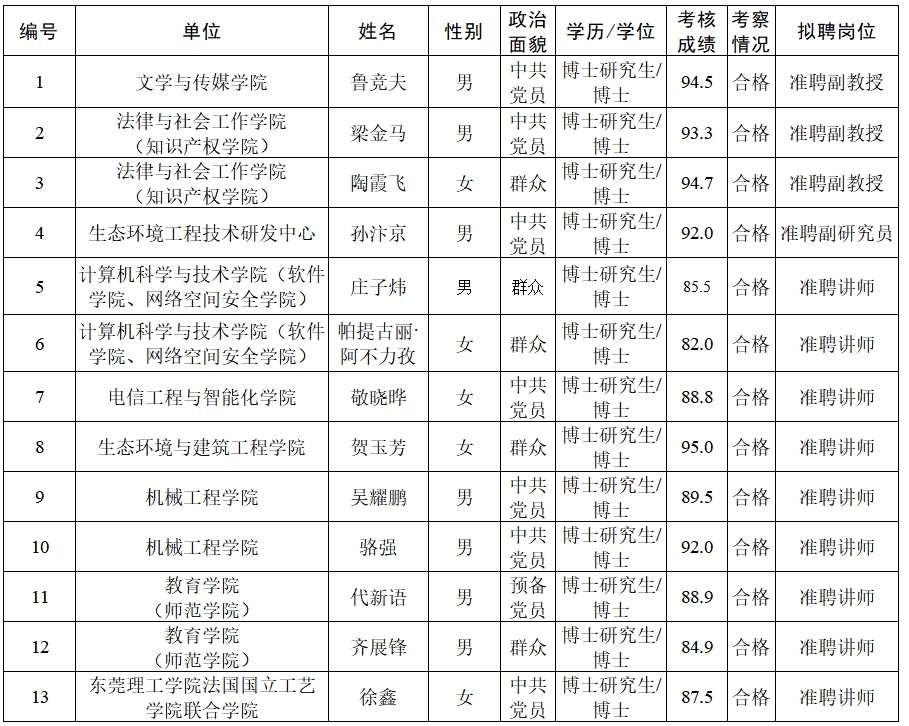 经过考核、考察等程序,拟聘用鲁竞夫等13名同志到3044am永利集团官网工作。现予以公示,公示名单见下表。