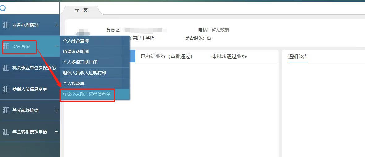 第一步:点击“综合查询”-“年金个人账户权益信息单”。