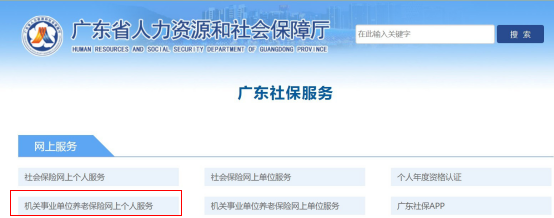 登录“广东省人力资源与社会保障厅”网址http://hrss.gd.gov.cn/gdsbfw/,选择“机关事业单位养老保险网上个人服务”。跳转至“粤省事”,按提示登录个人账号。