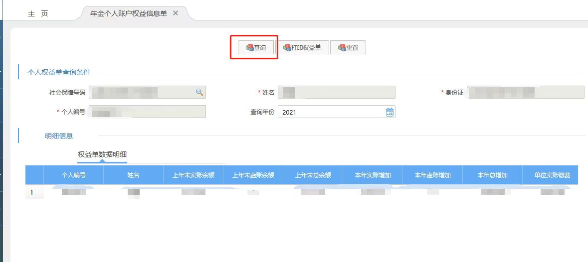 第二步:输入查询年份等信息,点击“查询”后,页面将显示职业年金个人账户相关信息。