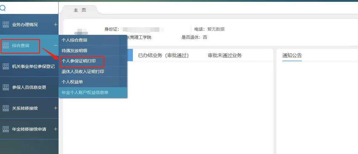 第一步:点击“综合查询”-“个人参保证明打印”。
