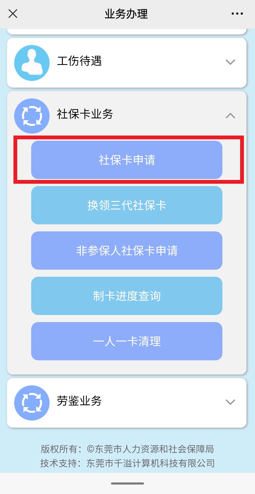 打开微信进入“东莞社保”公众号,点击“社保服务”-“业务办理”-“社保卡业务”-“社保卡申请”。