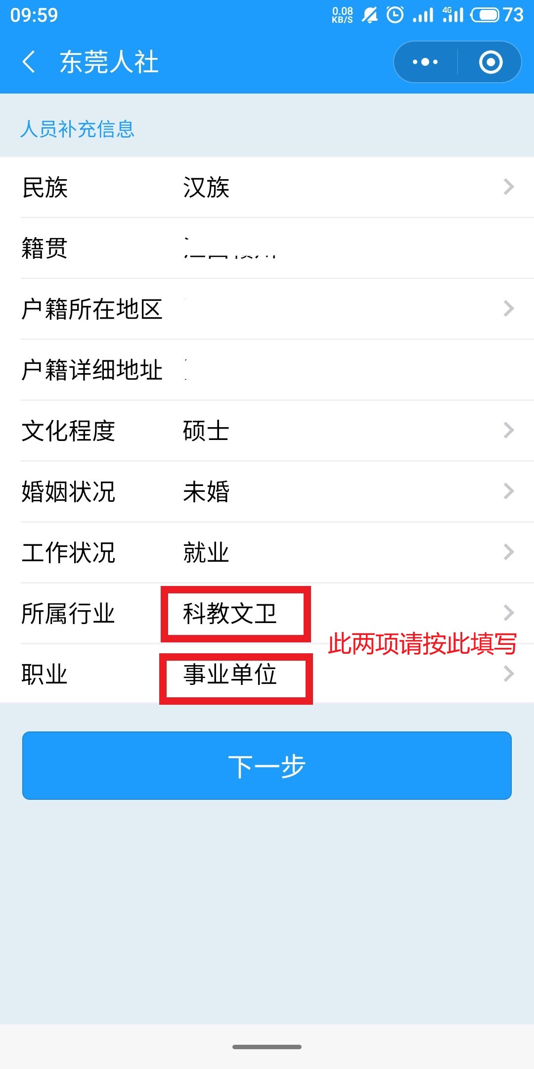 填写人员补充信息,所属行业选择“科教文卫”,职业选择“事业单位”,并确认全部信息无误后,点击“提交”(办理进度可在“东莞人社”小程序中的“制卡进度查询”中查看)。