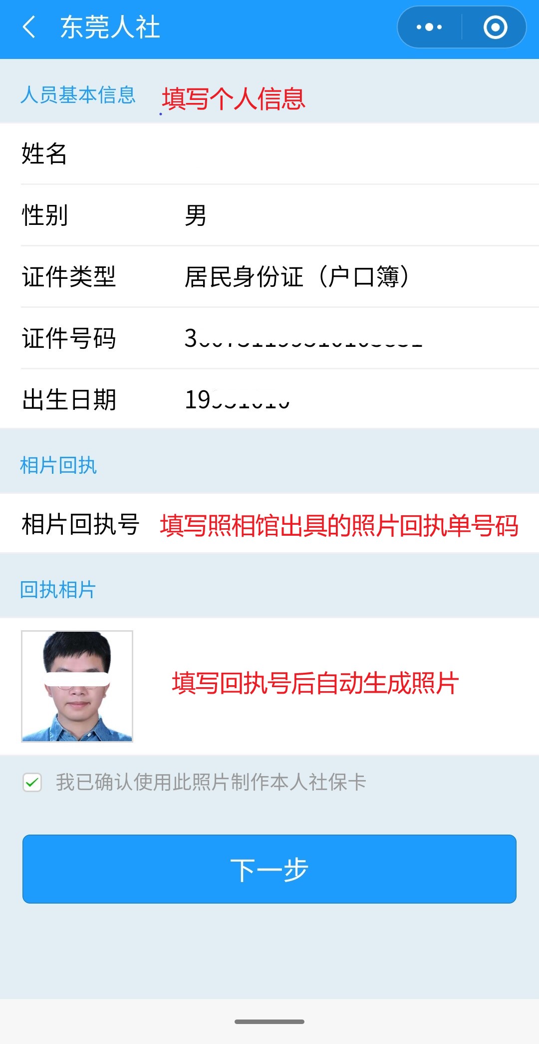 新进教职工在收到工资后的次月,到社保卡照片定点的照相馆或其他线上渠道开具“东莞市社会保障卡照片回执单”,获取相片回执号。
